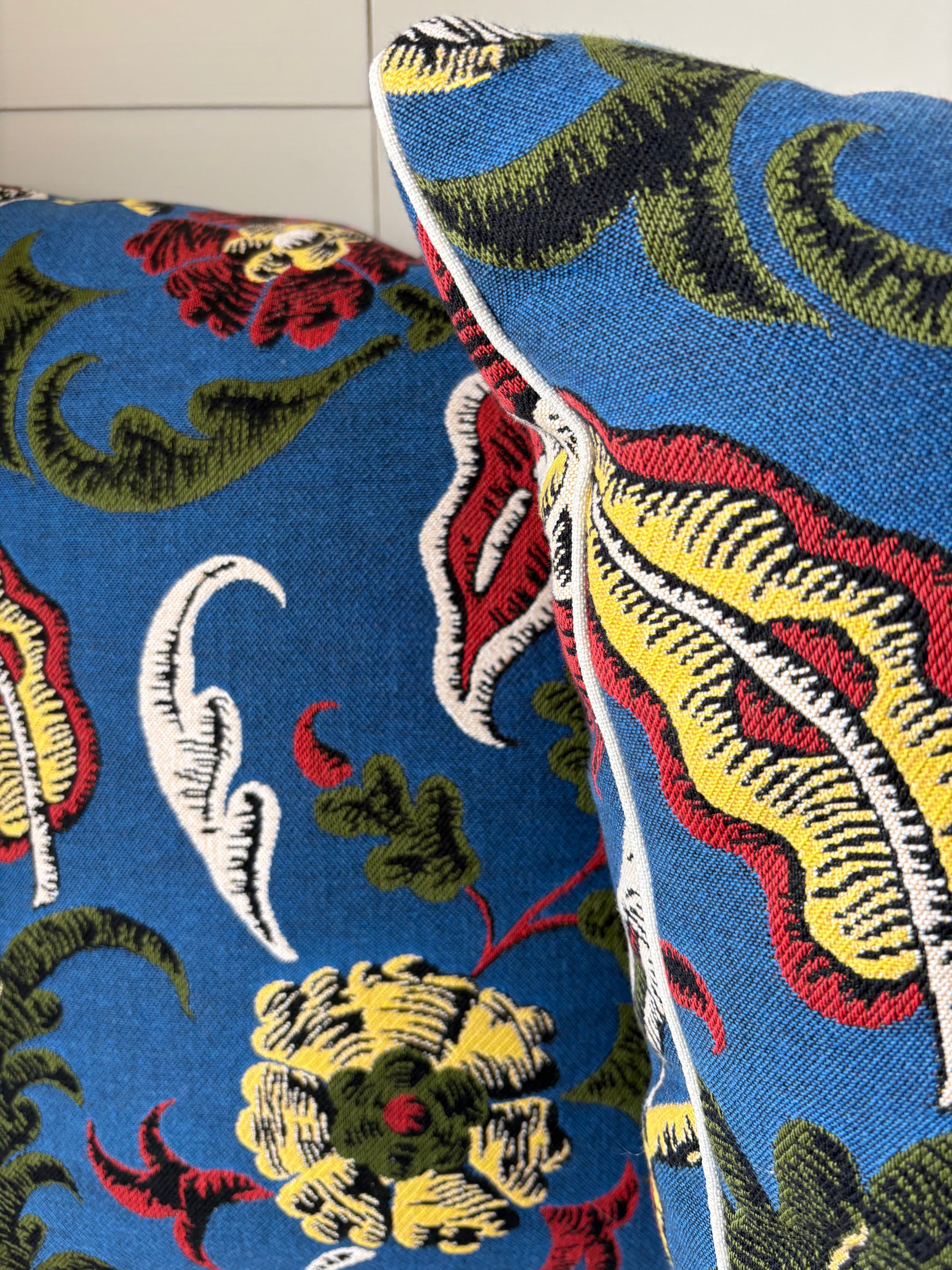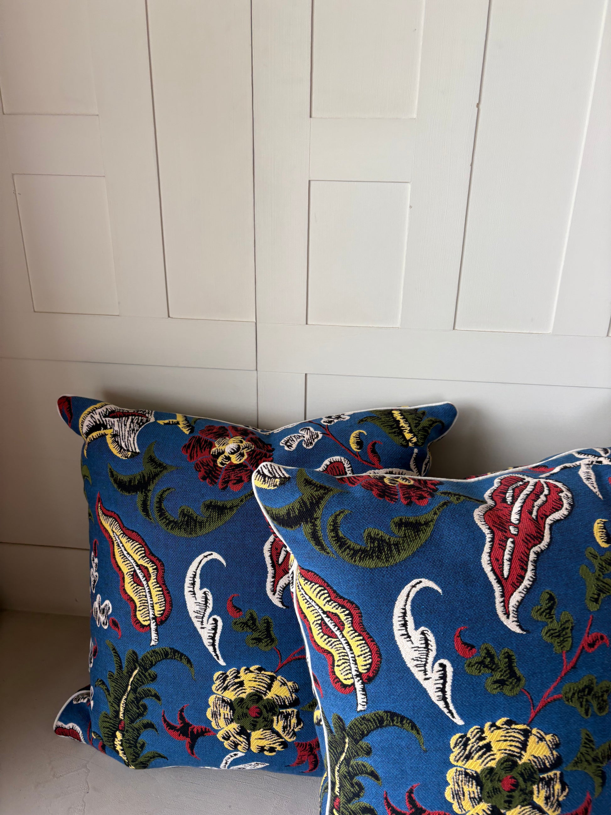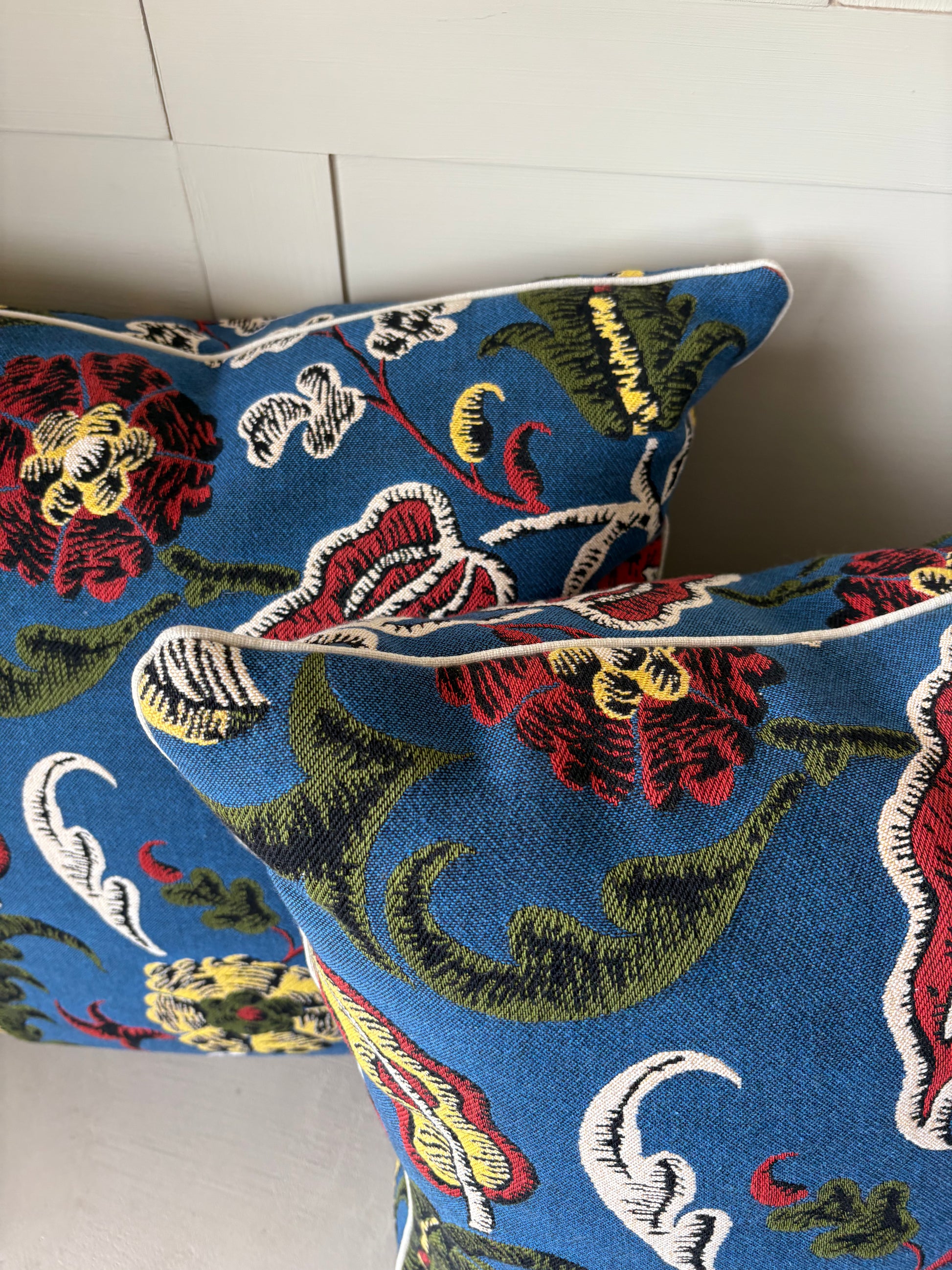 A statement cushion woven in deep cobalt blue, adorned with golden florals, curling green vines, and striking red accents. With its tapestry-like richness, it bridges bold pattern and timeless elegance, bringing both warmth and artistry into the home.