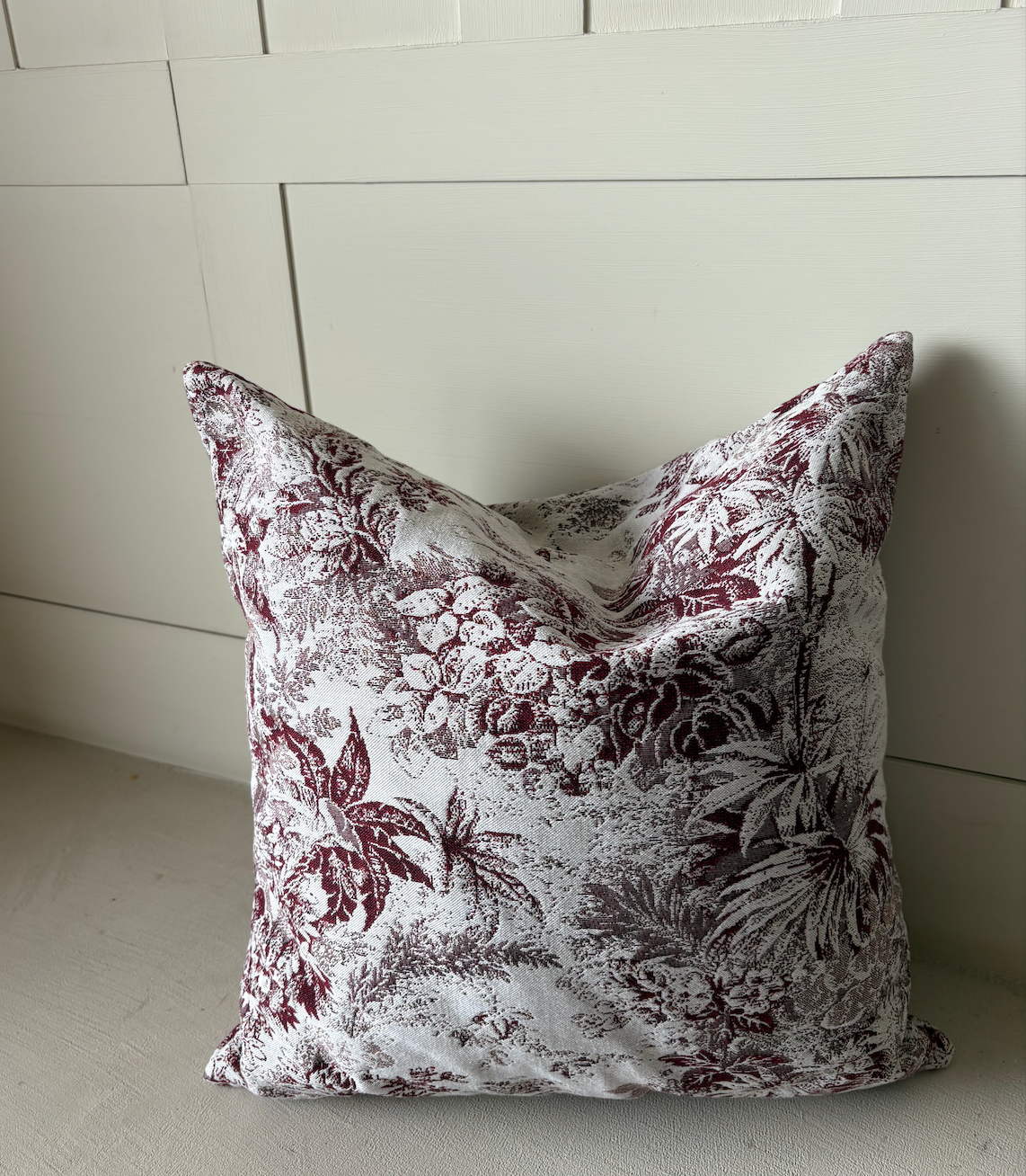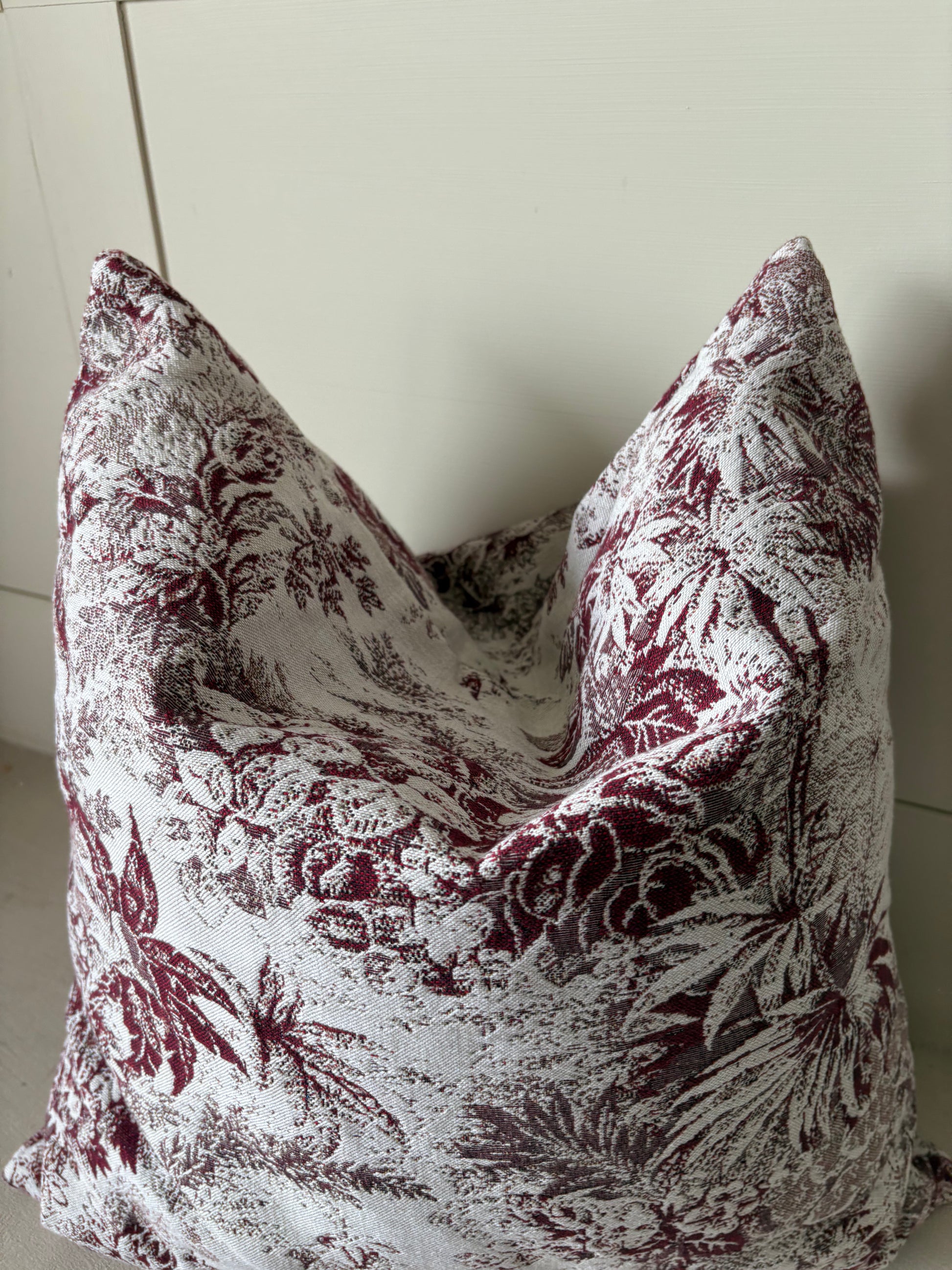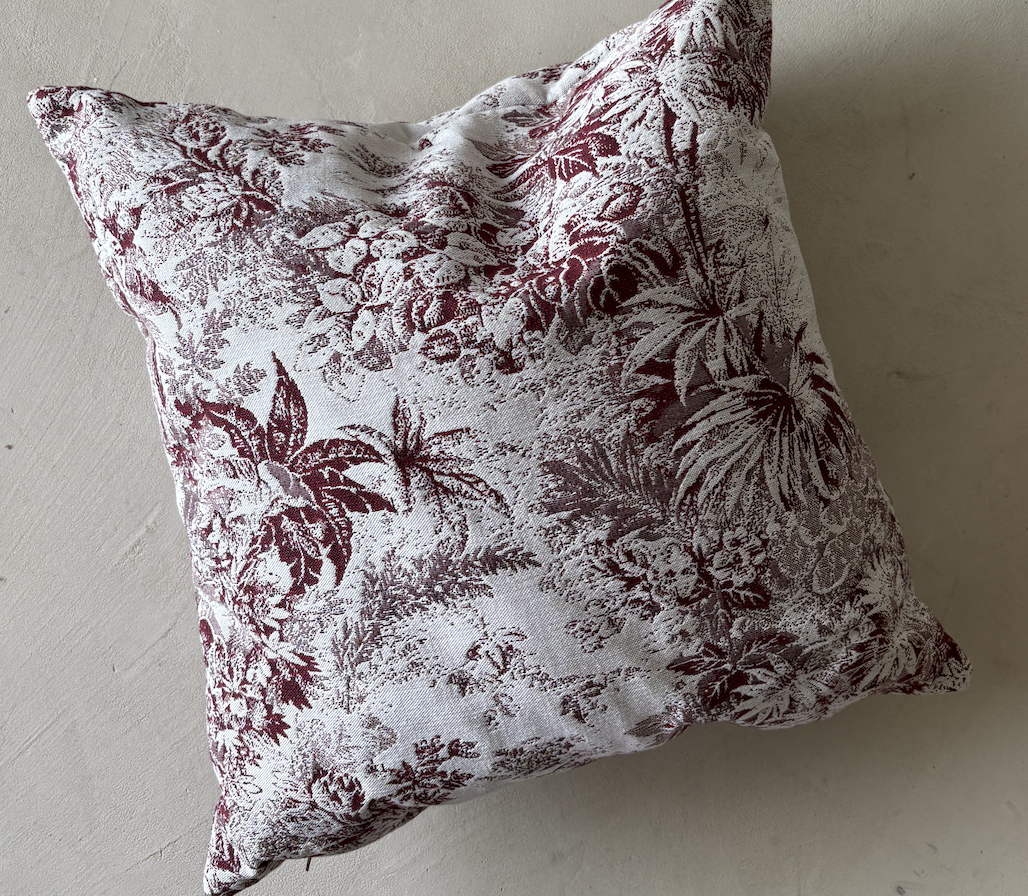 A refined cushion in ivory and burgundy, woven with an intricate toile-inspired motif. Its delicate pastoral patterns recall antique French interiors, bringing timeless elegance and warmth to contemporary living spaces.
