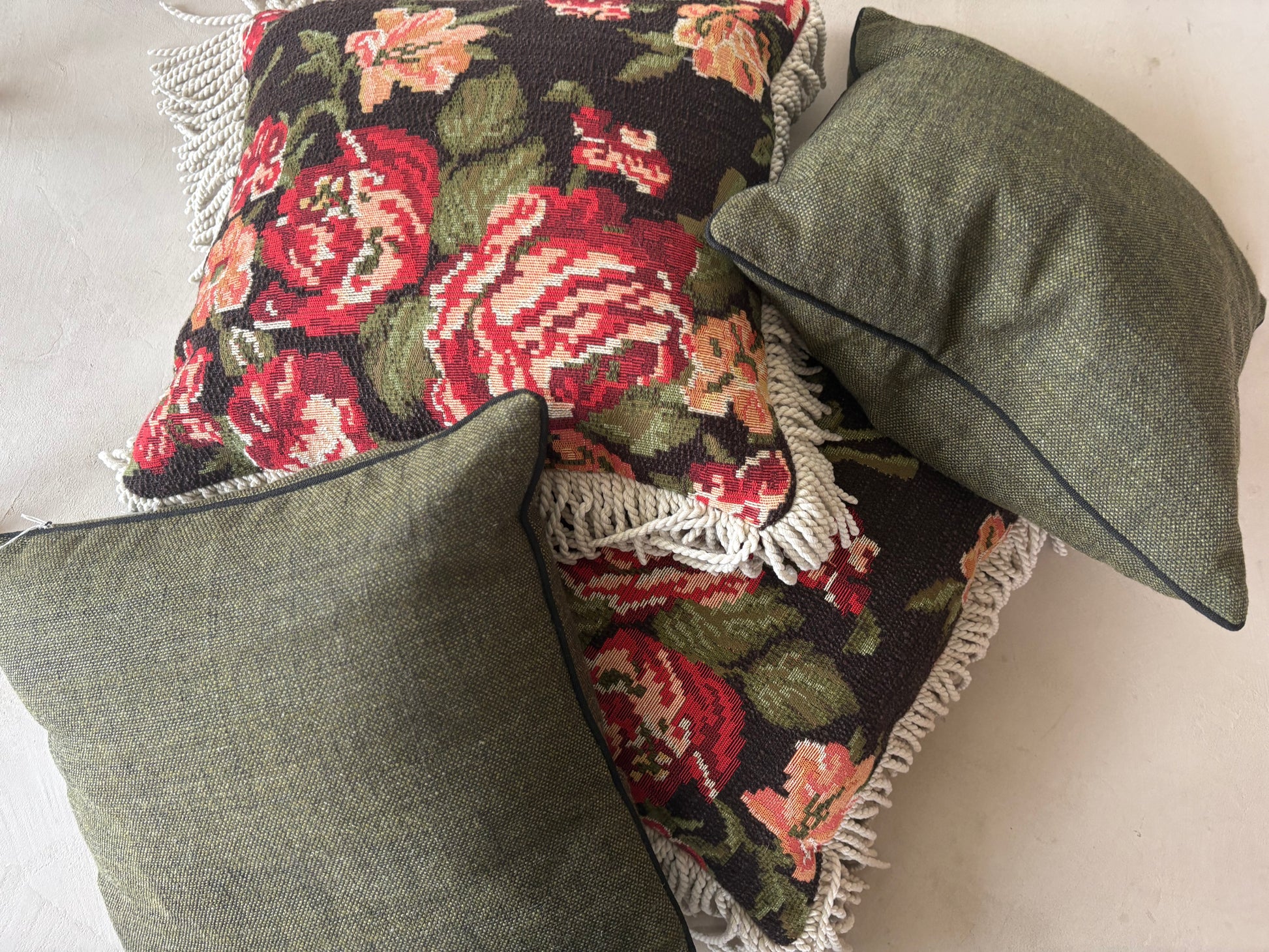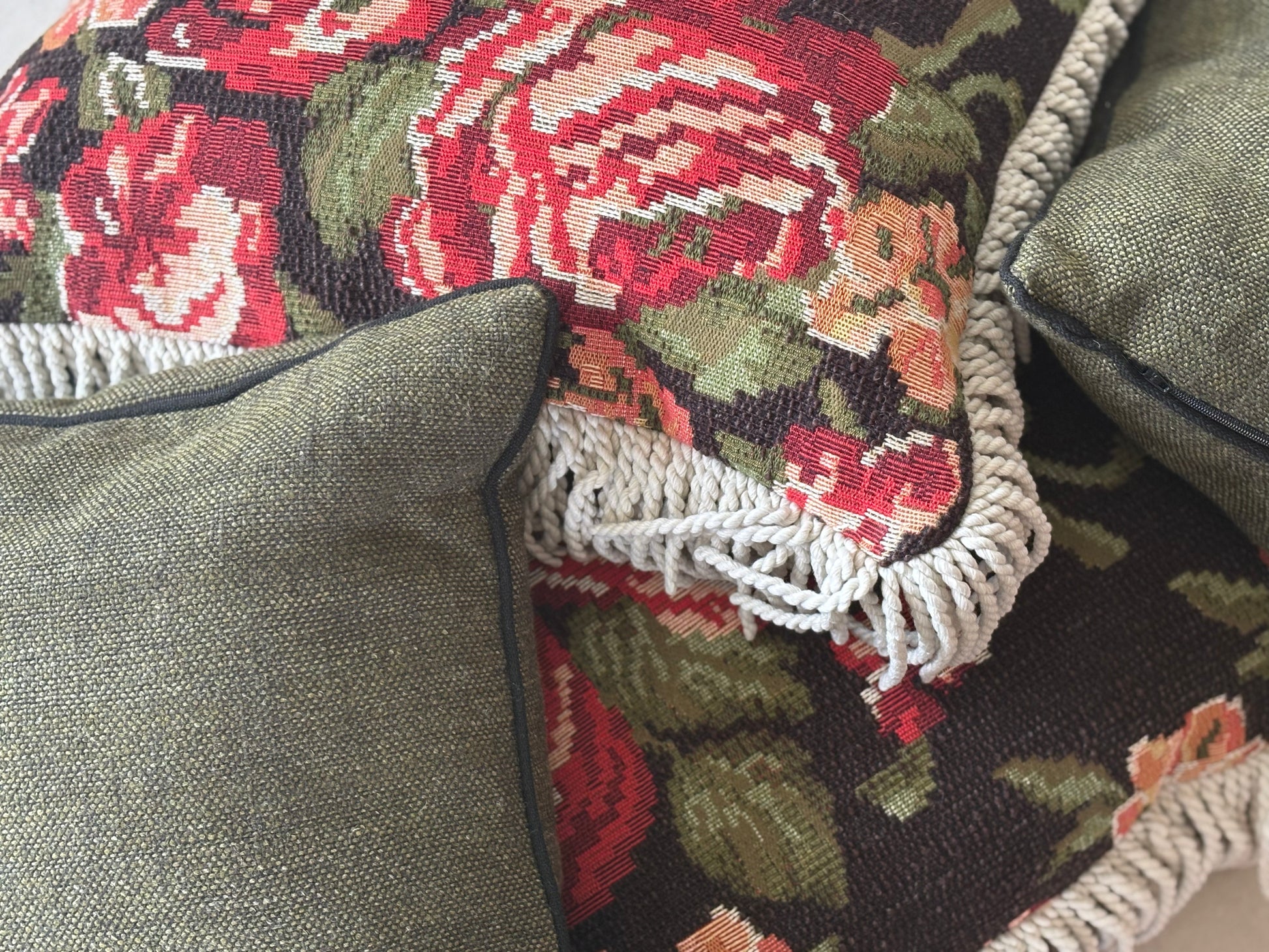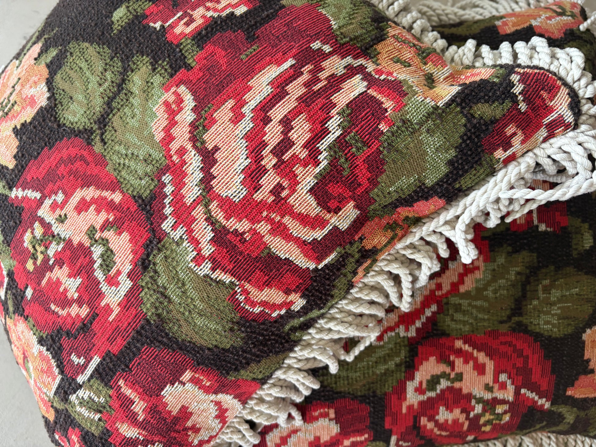A romantic tapestry cushion, richly woven with blooming red and blush roses against a deep, earthy backdrop. Finished with soft ivory fringe, Le Jardin Rouge brings old-world charm and bold floral storytelling into the home. A statement piece that blends nostalgia with warmth — echoing interiors filled with character and history.