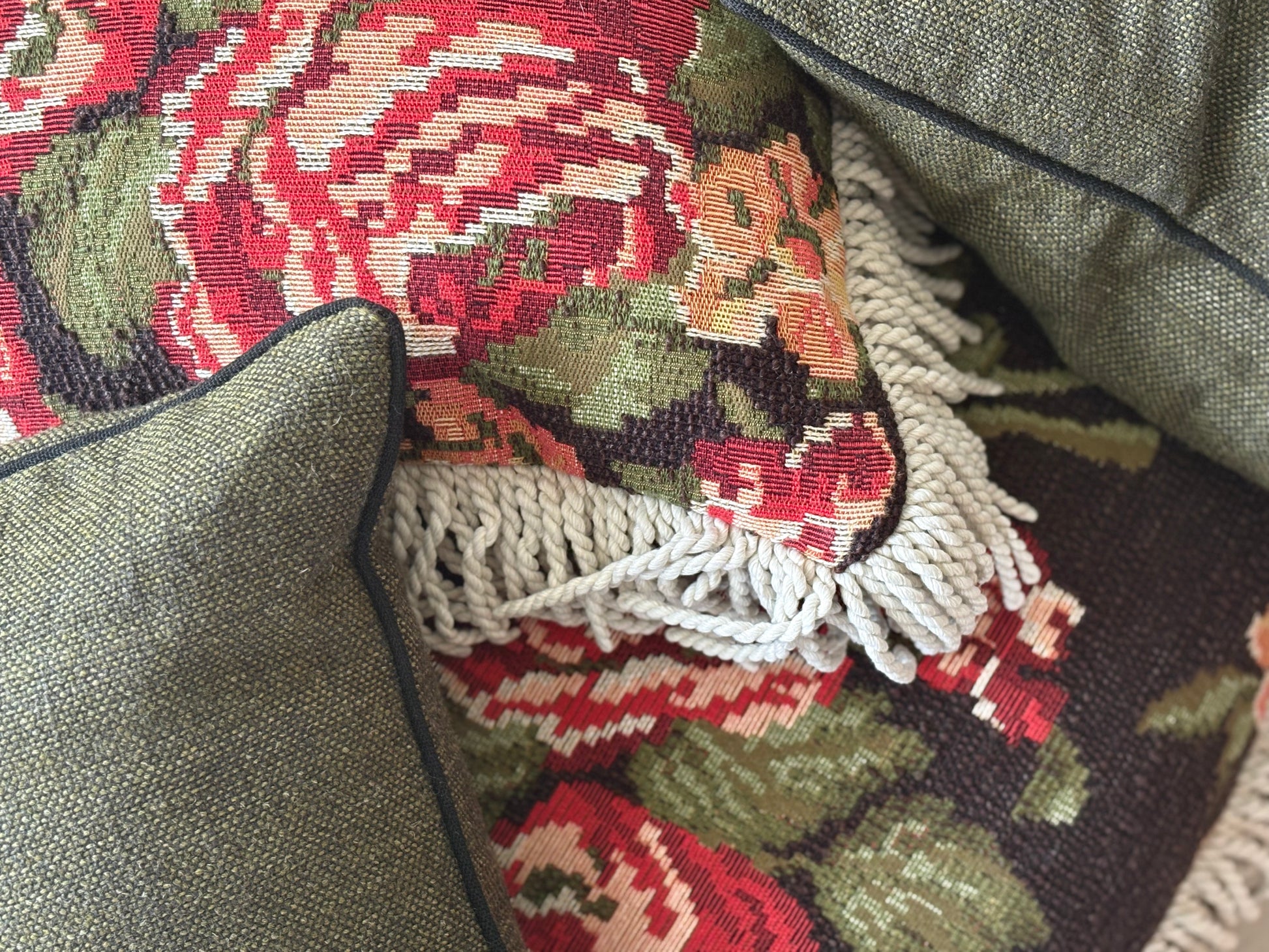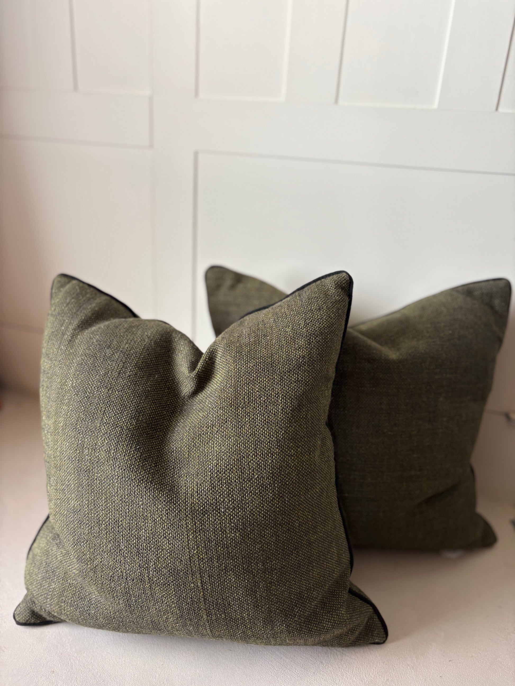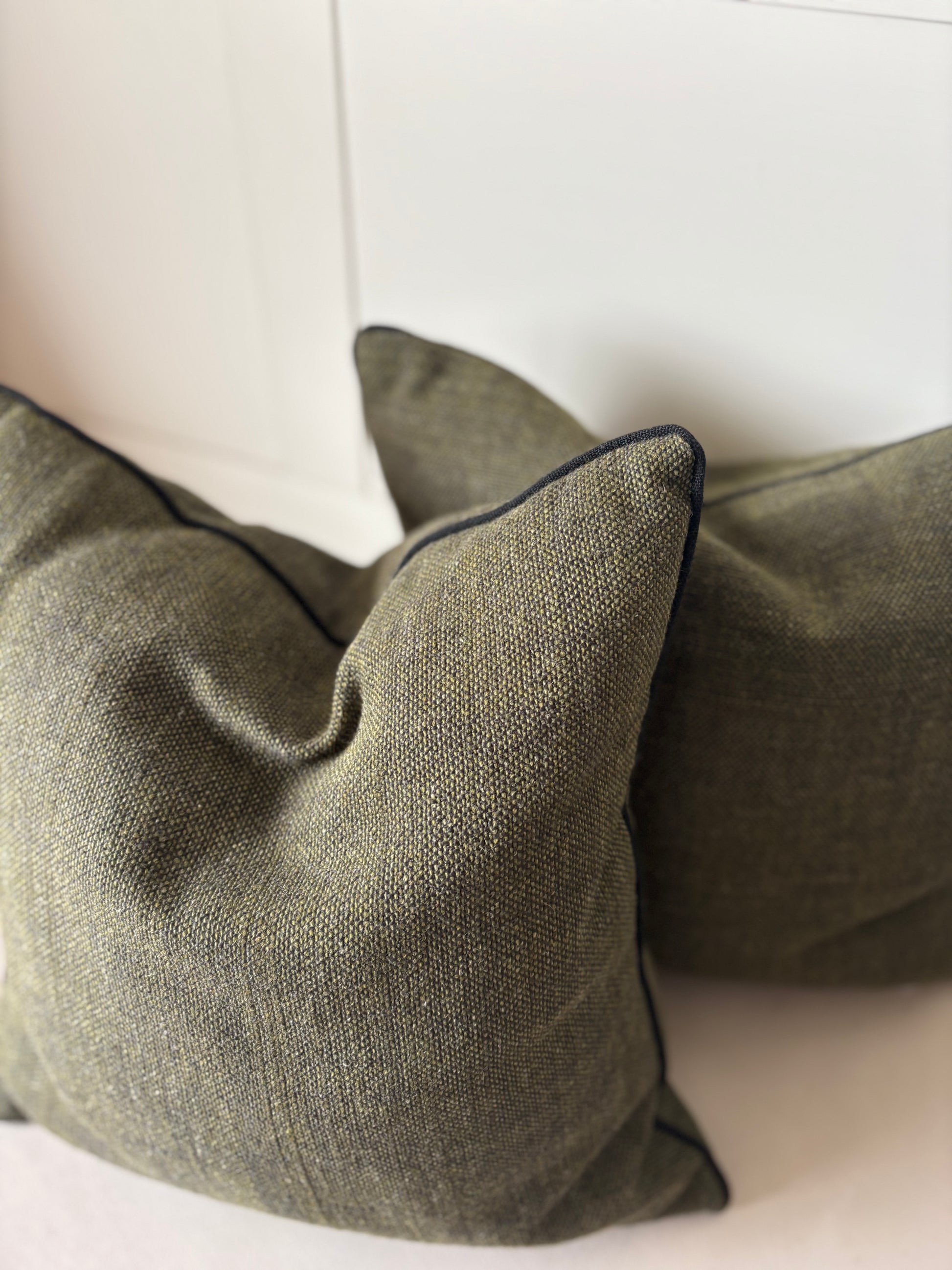 A timeless cushion in a soft, sandy olive hue, woven with subtle texture and finished with contrasting black piping. Its understated elegance makes it a versatile piece — grounding bold interiors or blending seamlessly into a neutral palette.