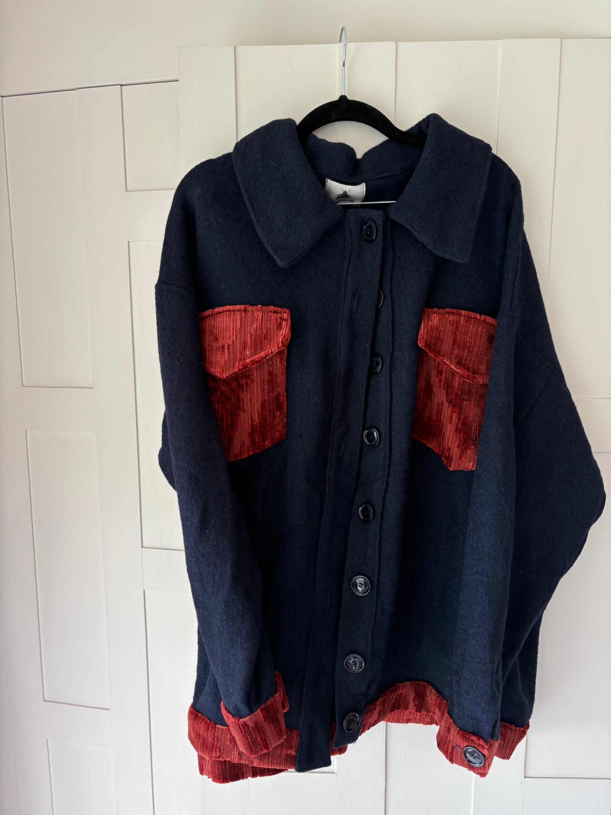 A cardigan-jacket in deep navy wool, punctuated with terracotta velvet pockets and cuffs. A denim jacket reimagined in unexpected fabric — merging workwear structure with decadent texture. Both utilitarian and romantic, it adapts fluidly to its wearer, shifting from bold statement to subtle companion, season after season.